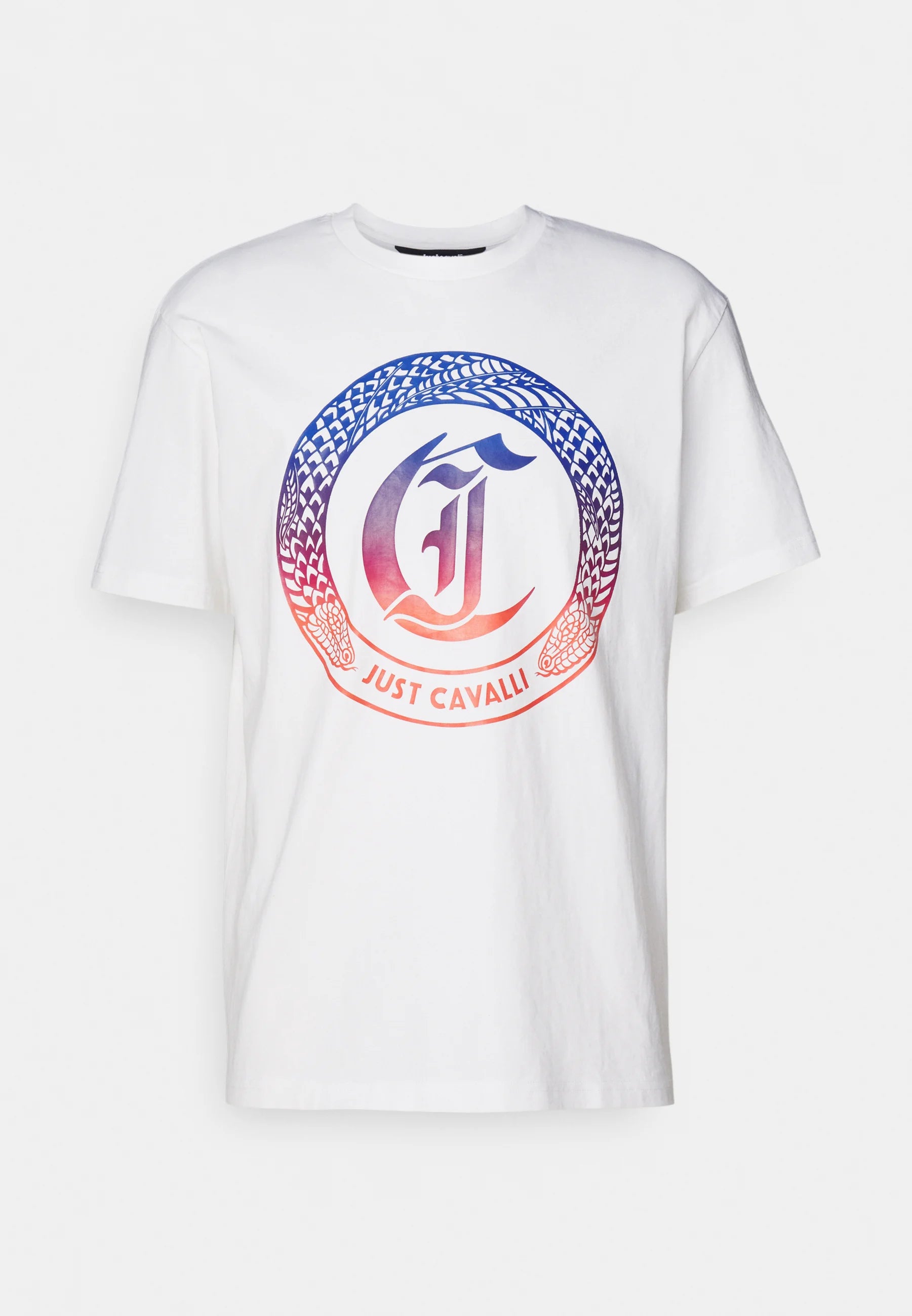 T-Shirt con stampa ROUND SNAKE firmata Just Cavalli, caratterizzata da girocollo e logo multicolore frontale. Il capo è stato studiato da Cavalli per rendere una semplice t-shirt un capo di appartenenza alla griffe da poter essere indossato per ogni evento.